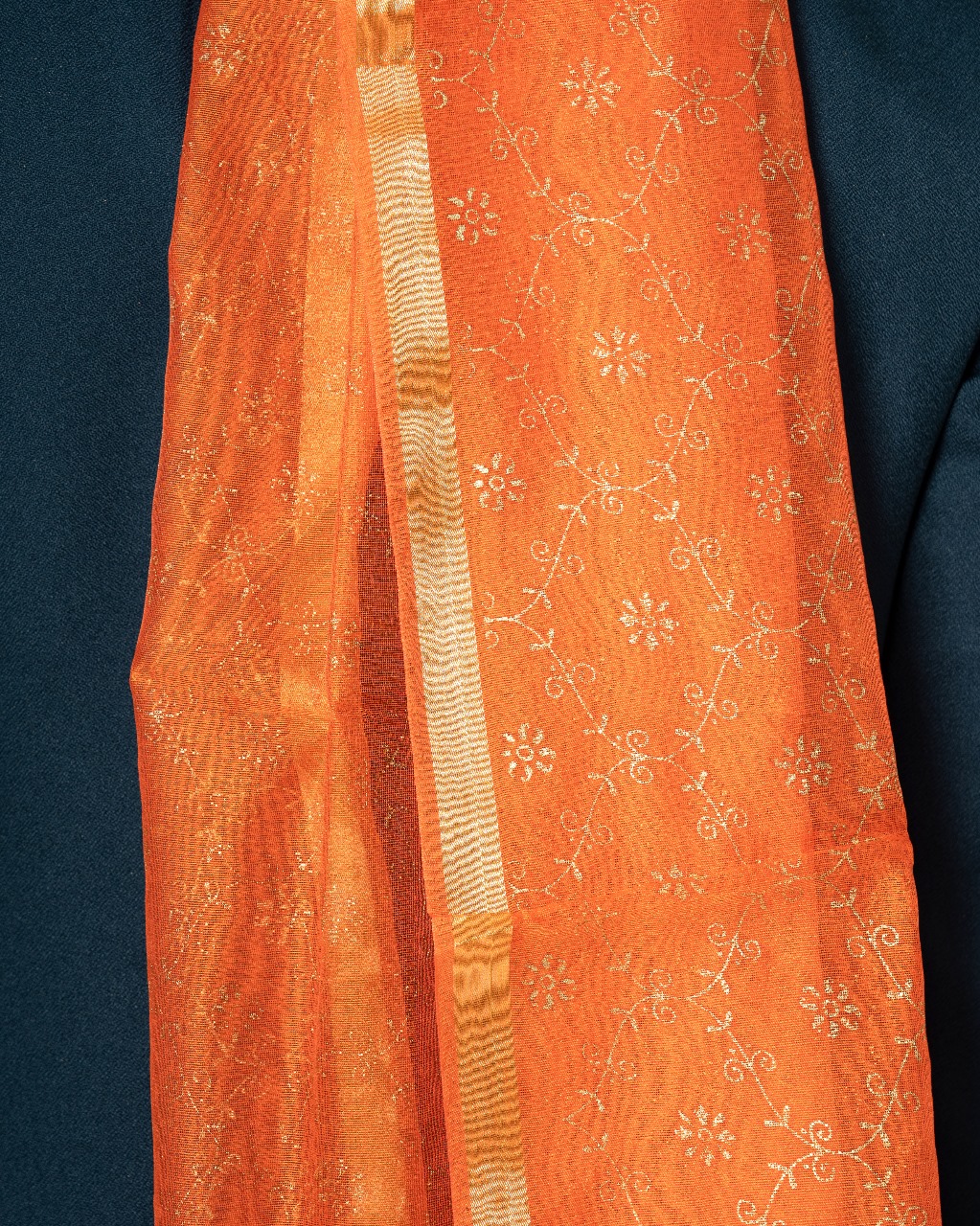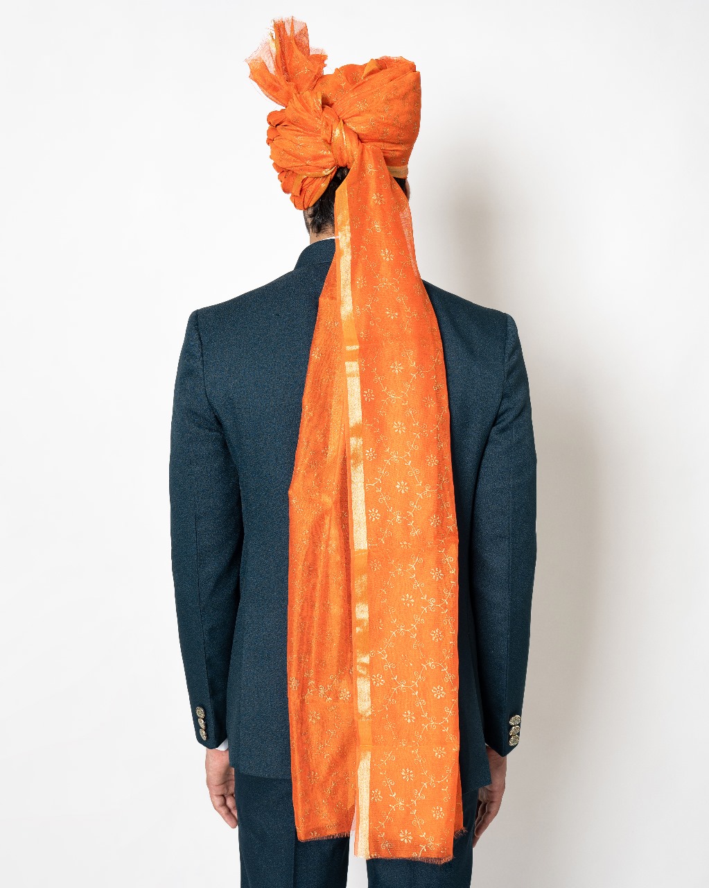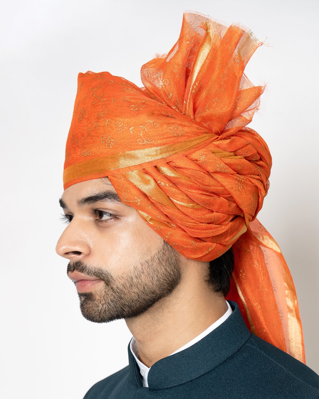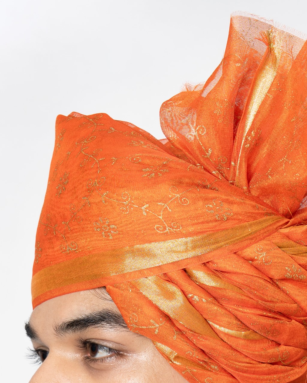 A majestic orange Banarasi safa featuring royal prints that exude grandeur.